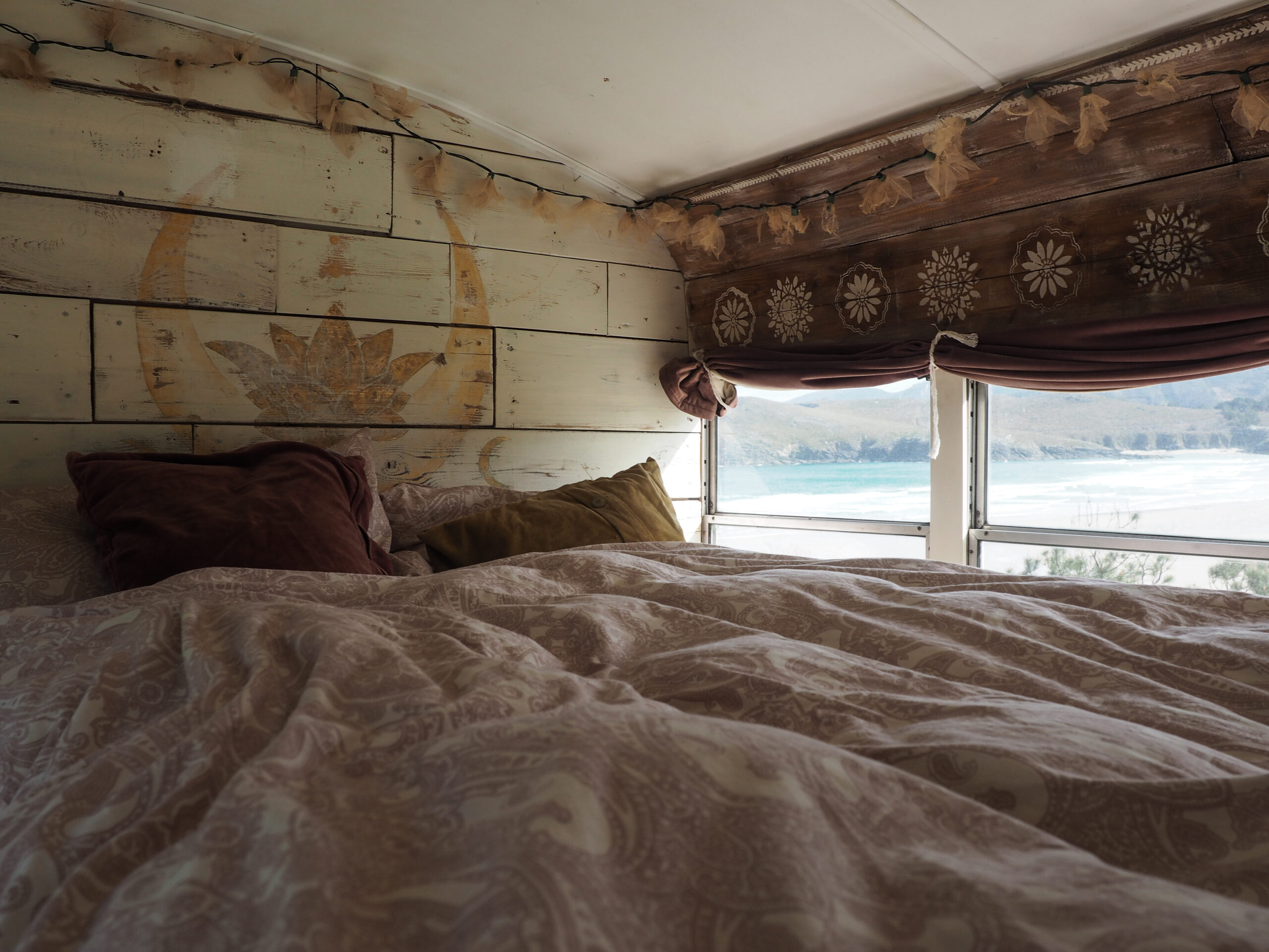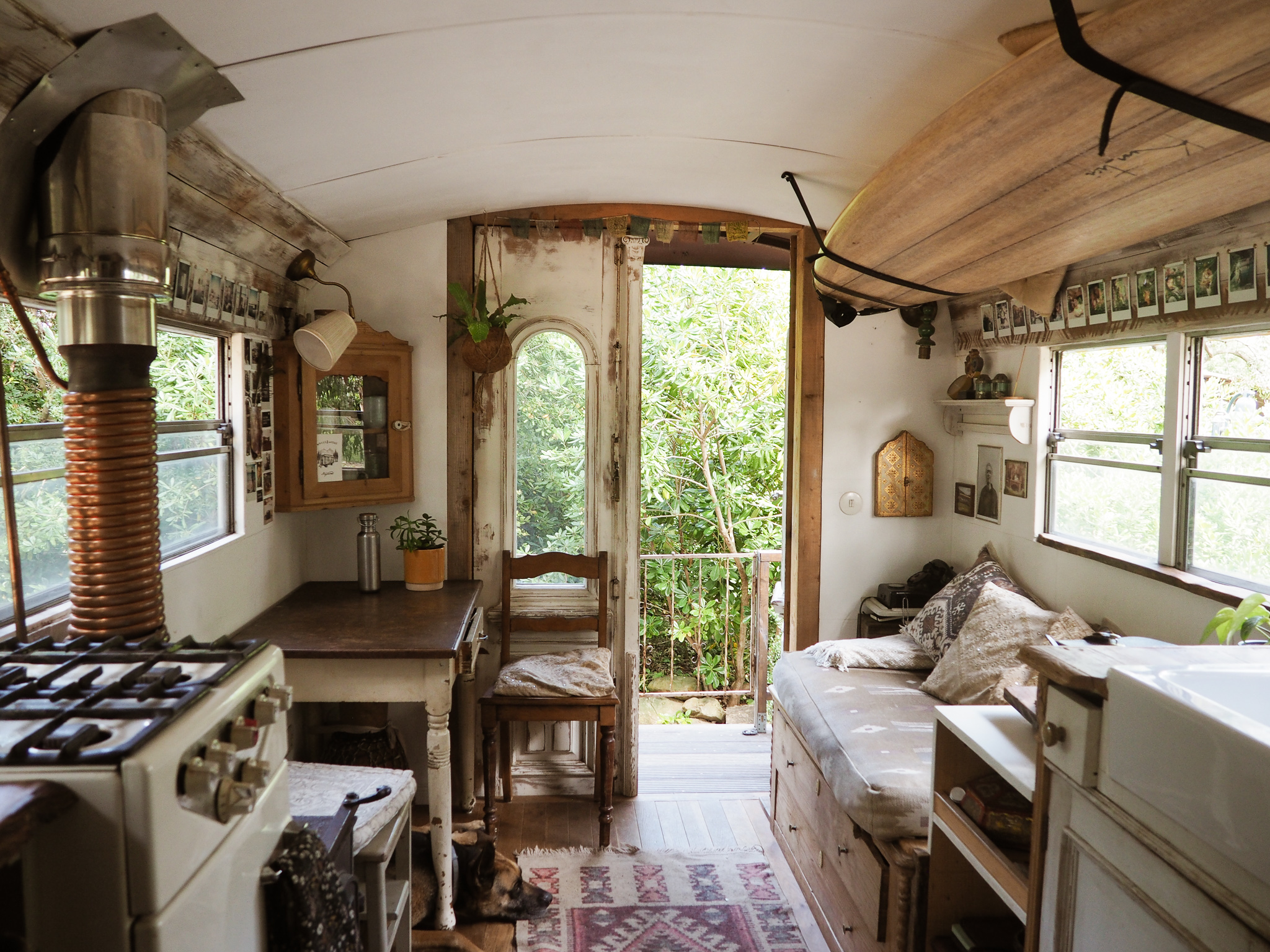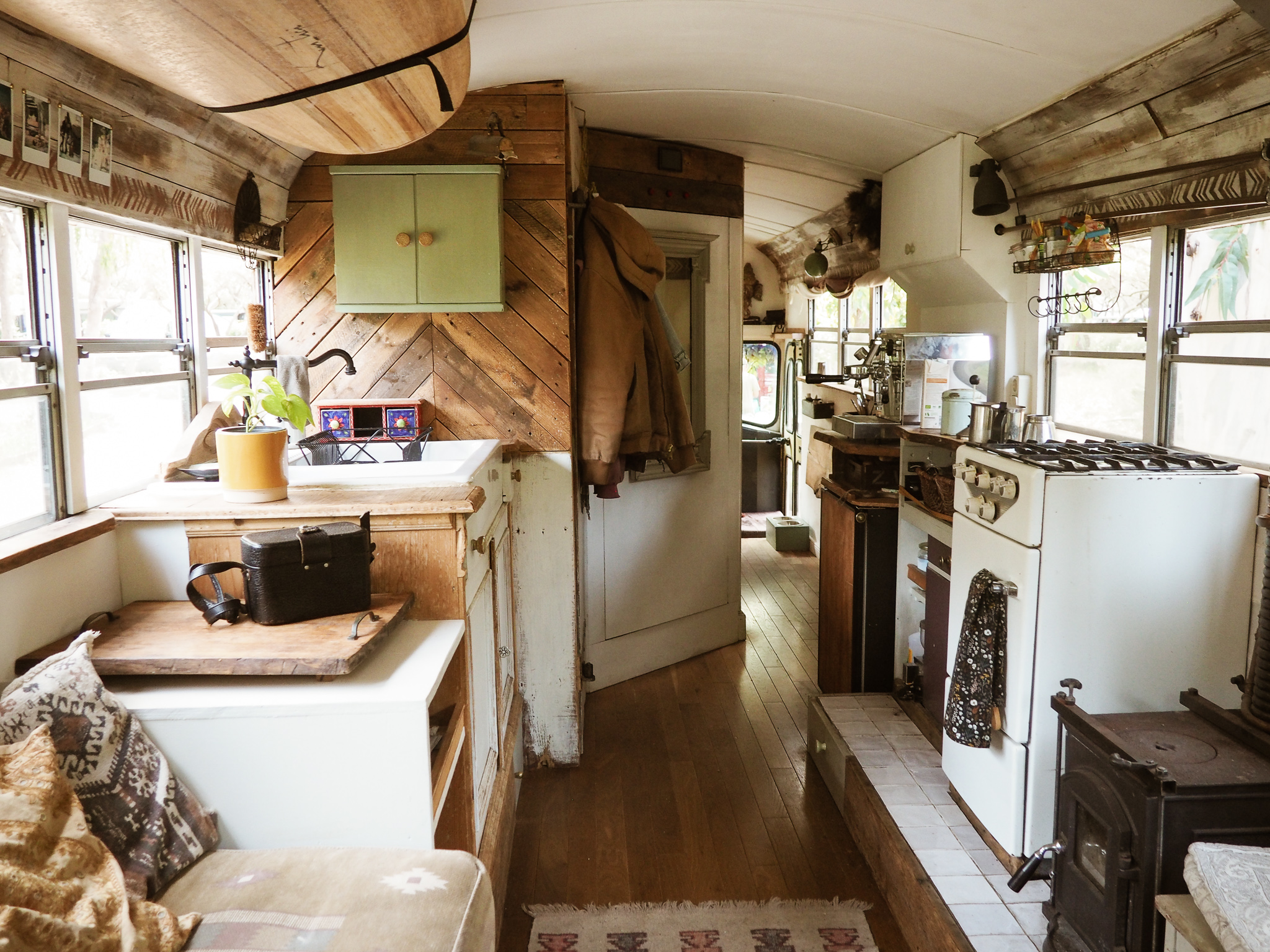 Der 300 Liter Frischwassertank versorgt uns mit ausreichend Wasser und mit unseren Wasserfiltern können wir sogar das Wasser aus einem Tümpel trinken. Der Innenausbau beinhaltet eine großzügige Küche mit Gasherd, Backofen, Holzofen, Spüle, Kühlschrank, eine Dusche, eine Komposttoilette, einen Arbeitsplatz, ein Sofa, jede Menge Stauraum, sowie Schlafmöglichkeiten für bis zu vier Personen.